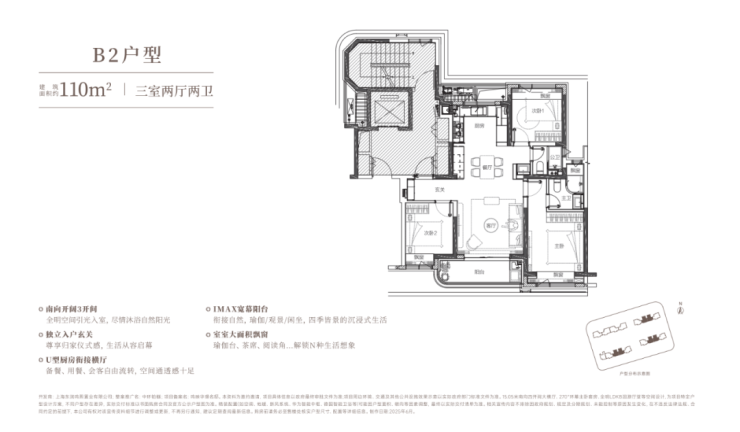 建面约110㎡边套(B1户型),1个宽面阳台、5个飘窗,整体南向面宽做到了约12.3米,大横厅面宽约5.4米,带来超大空间体验和充足通风采光。更为难得的是,该户型标配了全屋飘窗,主卧更是拥有270°转角飘窗,拓宽室内景观视野的同时,增加了实际空间使用率,加上三玻两腔系统窗隔音,在欣赏窗外景色的同时,也不会被噪音打扰。建面约110㎡中间套(B2户型),也同样做到了南北通透,三开间朝南,洄游动线,布局合理,无论是空间尺度还是通风采光,与边套享受一样的品质感!