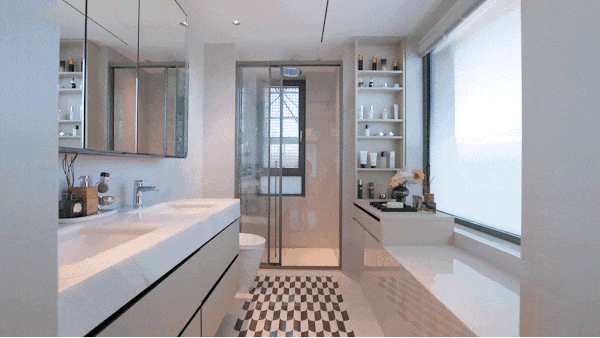 主卫同样配有纵向飘窗,空间通透敞亮,毫不压抑。全明卫生间配置高端体验,选用恩仕智能马桶,汉斯格雅龙头花洒与杜拉维特台盆共同打造高品质洗漱动线,线性浴霸实现快速均匀取暖。镜柜巧妙收纳日常用品,让台面长久整洁清爽,更特别配备美妆冰箱,贴心照顾护肤需求。