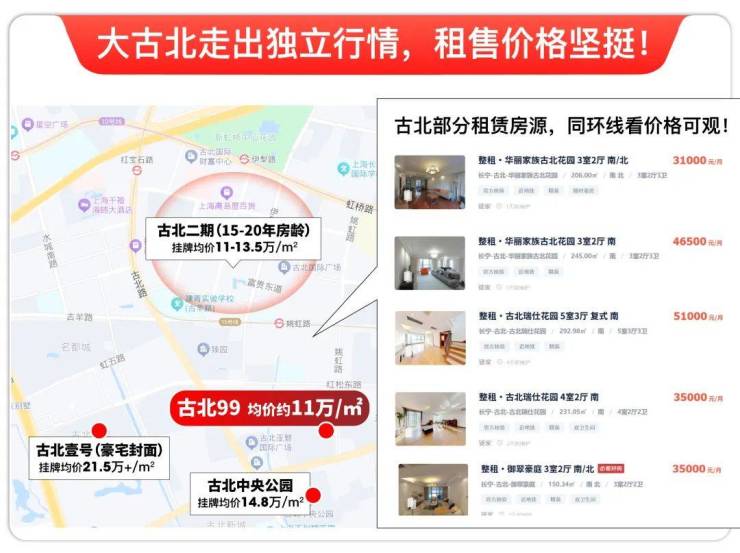 古北二期房龄接近20年,挂牌价格依旧能挺在11-13.5万/㎡;古北中央公园挂牌约14.8万/㎡;价格天花板的古北壹号次新房挂牌价约21.5万/㎡。