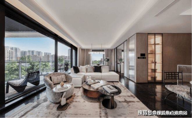 外立面:项目以“雅映金石”为设计理念,采用横向大面积连贯玻璃及落地窗,搭配铝板和中空LOW-E三玻两腔,形成大规模窗墙比,实现了极致的采光和视野