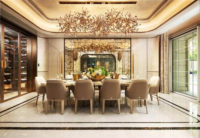 傍晚,在建面约700-850㎡独栋空间的恢弘客厅与餐厅,举办一场彰显身份的私宴。