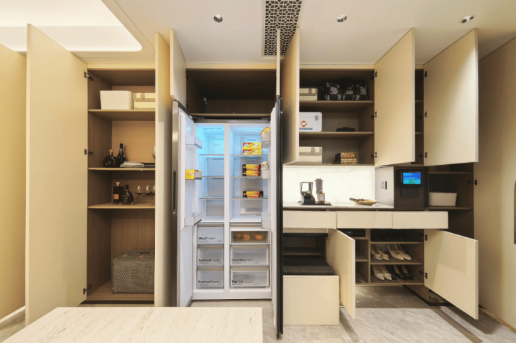 "分户s墙"设计在分户墙处增设“凹型空间",“冰箱外移"增加厨房操作台面和收纳空间,创造更合理的餐厨桌台动线。