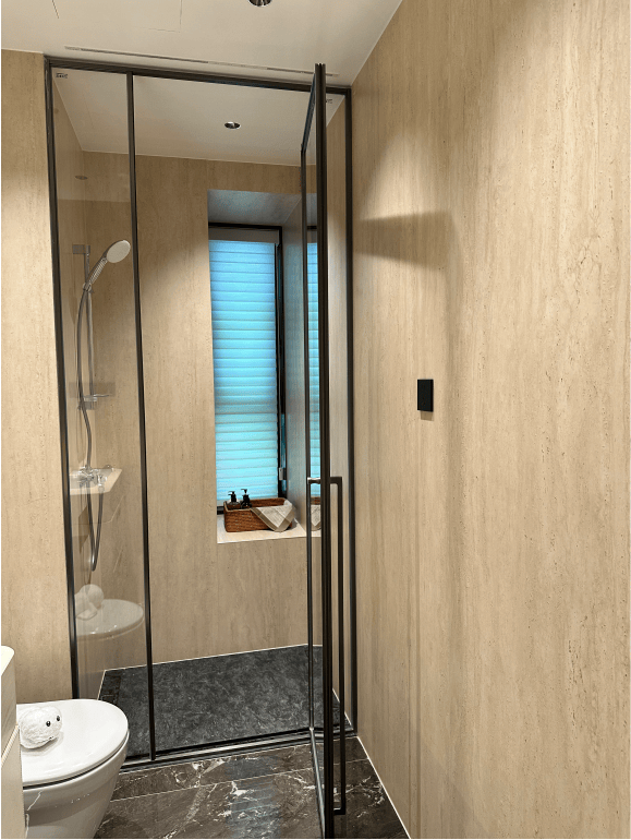 次卫则是采用不同风格,墙面统一采用米洞岩板、地面为深咖色瓷砖,黑金配色风格区别于看多了的海派设计,眼前一亮: