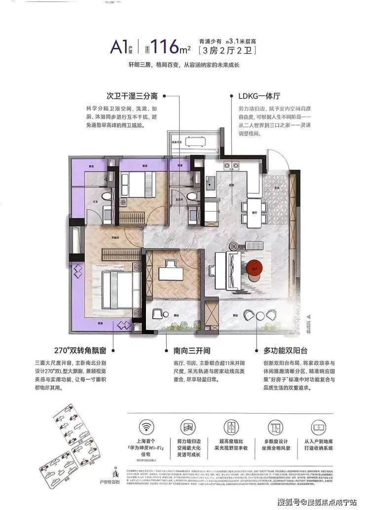 建面约116㎡3房2卫动静分离的户型,几乎是这个市场上最好的户型。