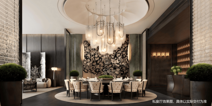 项目立面以多种新中式元素构筑东方建筑美学,横向采用大面玻璃幕墙,保障隐私的同时,尽可能的增大建筑内外场景对话。