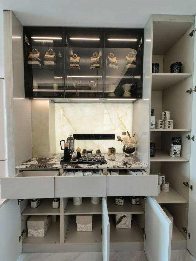 餐边柜也做了多层收纳空间,方便酒具、茶具的摆放!