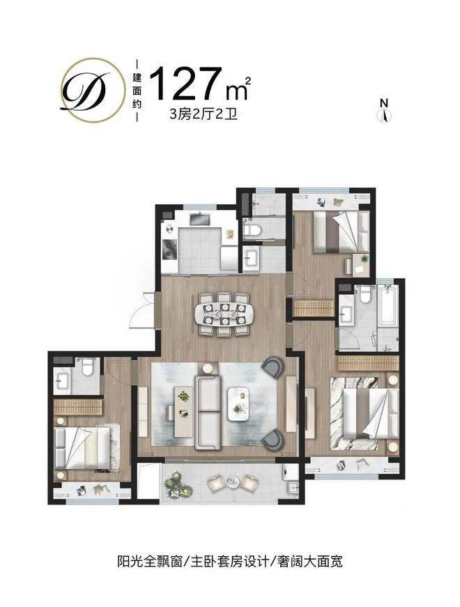 实用性方面,户型3房3卫、南向双套房的设计,可以保证每个家庭成员都能拥有更具私密性的居住空间。