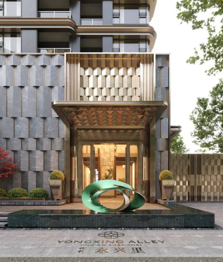 复刻和平饭店酒店式门庭,引入酒店式双线归家仪序,五进入户礼序与四重车仪之道,置身于海派隐奢的世界。高定酒店式落客区,尊奢入口,以国际顶奢酒店华尔道夫安曼式礼序营造,尽显尊贵风范。