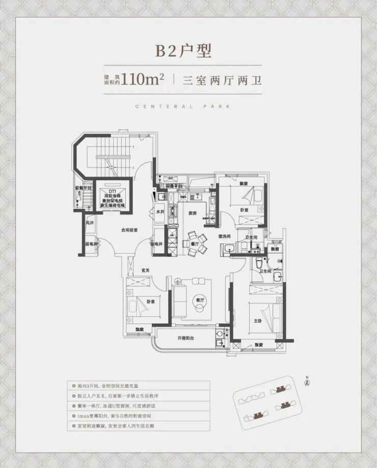 建面约110㎡中间套(B2户型),也同样做到了南北通透,三开间朝南,洄游动线,布局合理,无论是空间尺度还是通风采光,与边套享受一样的品质感!