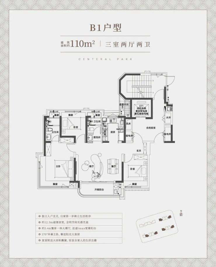 建面约110㎡边套(B1户型),1个宽面阳台、5个飘窗,整体南向面宽做到了约12.3米,大横厅面宽约5.4米,带来超大空间体验和充足通风采光。