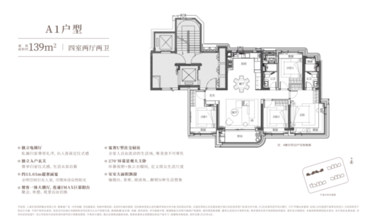 4#楼户型为建面约139㎡四房,拥有“个性大四房+15.05米IMAX大面宽+一梯一户(边套)+270°转角飘窗”构建纯粹改善设计。