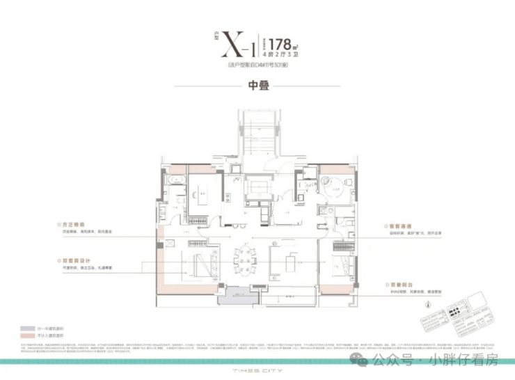 中平户型以四开间朝南的IMAX级采光面,打造出堪比市区豪宅的尺度感。4房4飘窗2阳台的设计,配合双套房布局,一共有三个套房,让每个家庭成员都享有独立私密空间。