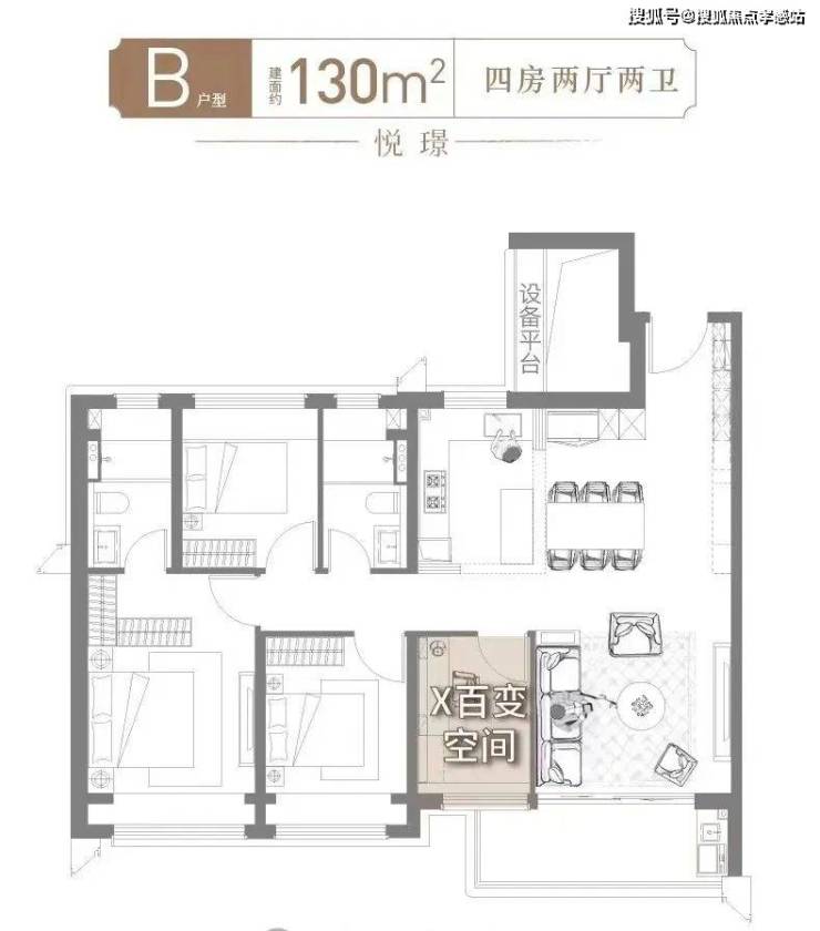 130㎡4房2厅2卫户型图如下: