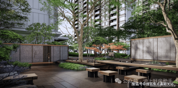 雅致石院与中庭古树相映,植物组团错落有致,营造出清逸山水园林之美,唤醒人们对林荫树下休憩闲聚的场地记忆。