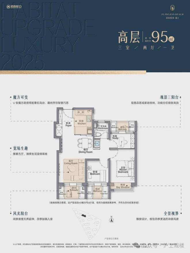再加上南向大面宽短进深、全卧飘窗、L型转角阳台设计,哪怕小户型95㎡3房,尺度感都超棒,采光和视野更是一流。