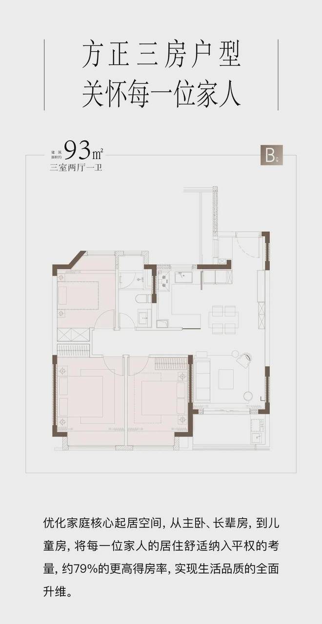 但超高的得房率为尚湾林语的约93㎡户型带来了正3房的格局, 主卧+次卧的尺度感都非常不错。即使是书房也有不错的空间,未来打造一个儿童房也绰绰有余。