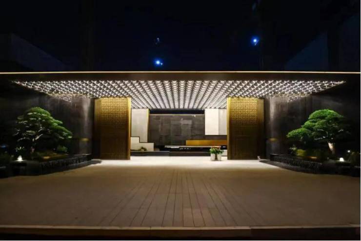 大门两侧采用复古与现代交融的乱纹黄古铜饰面,与6米挑高的建筑体量形成视觉张力,延展墙体通铺亚光面深色奢石大理石,恢弘大气。