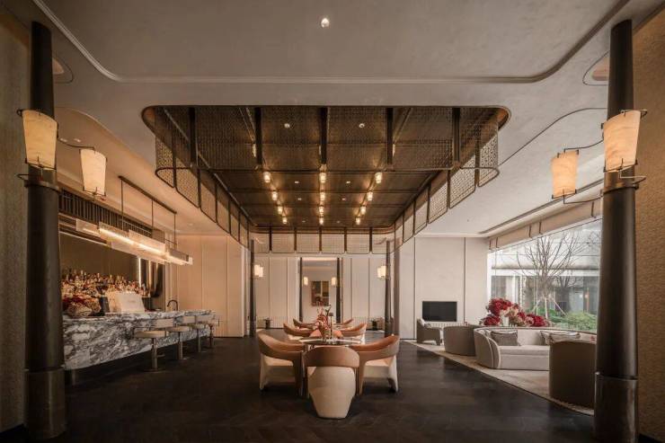 另外,项目首层通过硬朗直线呼应柔和曲线勾勒,辅以温润石材与古铜色金属线条融合,打造东西方美学共融的艺术藏品。