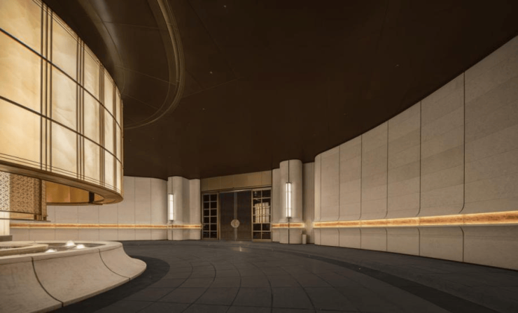 招商序藉由“吴淞灯塔”及其形制,原创落客雕塑“源流”,保加利亚进口的沉香米黄石材的底座,搭配以安哥拉黑大理石、云石玻璃,营造温润归家昭示。整个前庭形成艺术感与实用性兼具的环岛式落客区,进一步提升仪式感。