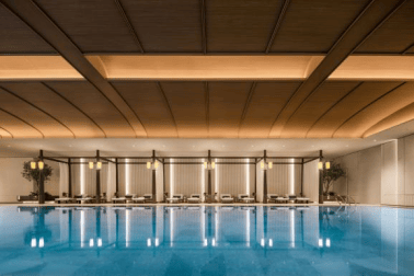 以“室内外自然无界”为理念,无边泳池与庭院景致在视觉上融为一体。阳光跃入蔚蓝水面,业主在畅游之际,亦可将满园诗意尽收眼底。池畔,深色木构架轻盈撑起白色帷幔,躺椅设计延续豪华酒店的优雅与尊贵;穹顶则融入海派经典元素,以木纹铝板精细雕琢。以往专属奢华度假酒店的体验,如今在归家楼下即可从容享有。