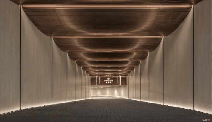 通过迎宾楼,便来到了约20米长的精神游廊,该精神游廊同源招商玺“树宅相守”的设计手法,更致敬建筑诗人斯卡帕“以自然光感去创造时间驻留感”的理念,通过对光线、材质与空间的创新打造,营造充满宁静的归家场域。