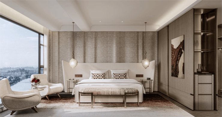 主卧套房,不仅有豪华卫浴,女王卫生间+双台盆,大尺度衣帽间,甚至书房、工作室空间就在边上,业主能体验无上的尊崇与私密。
