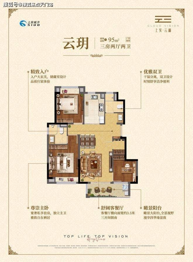 约95㎡三房两厅两卫,做到了三开间朝南+瞰景大阳台+主卧套房设计+南北通透+卫生间干湿分离,该户型得房率和空间利用率都非常高。