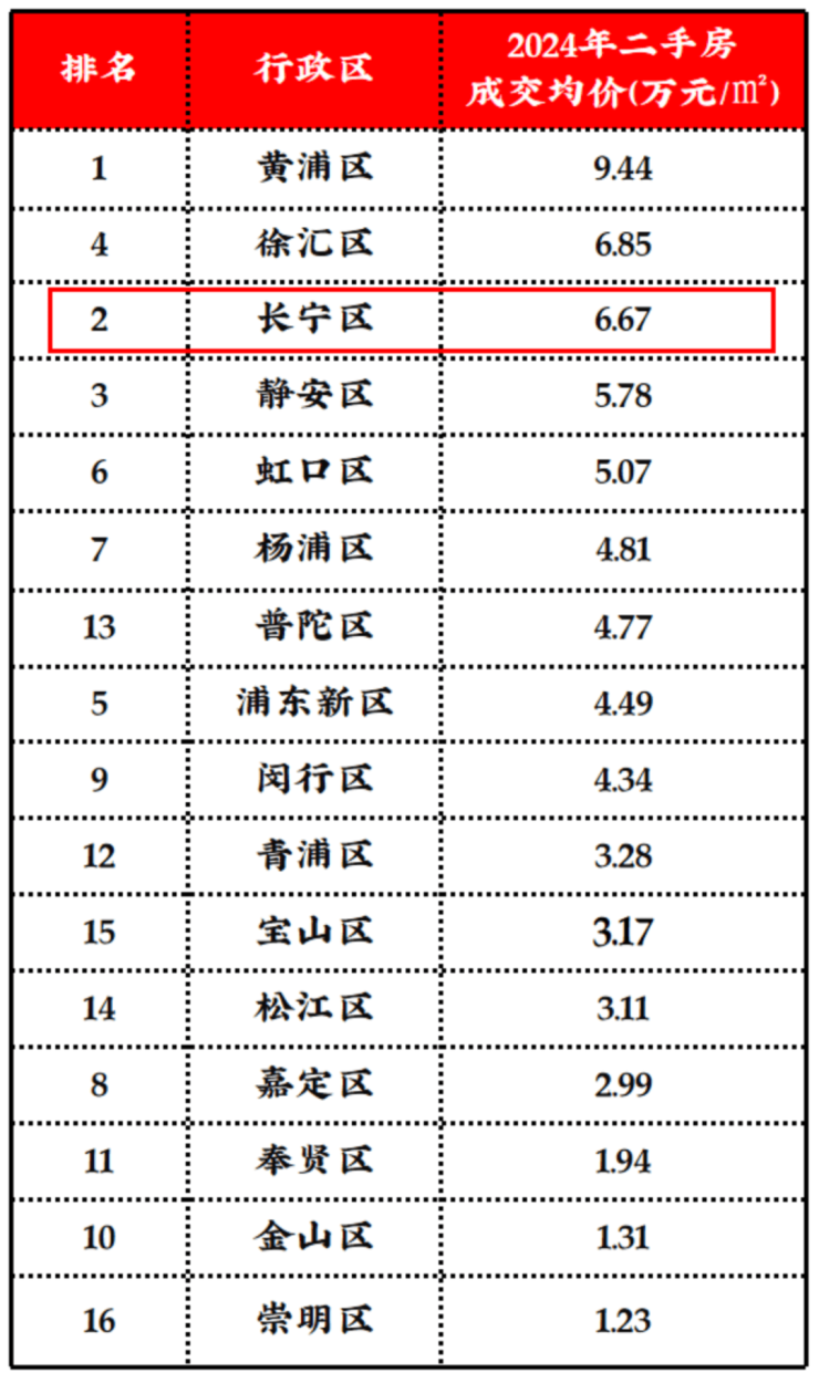 和徐汇滨江、杨浦滨江甚至是黄浦静安相比,长宁的新房供应真的是太“克制”了,所以,2024年长宁区二手成交均价(约6.67w)超过了静安(约5.78W),仅次于黄浦徐汇全市第三。
