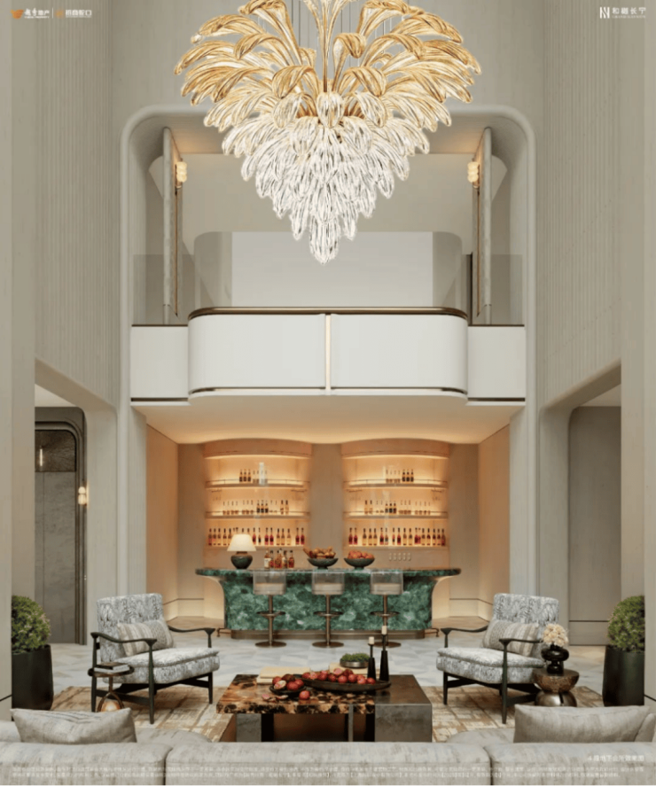 公区部分,基本以古铜色金属、暖色灯光和米色石材搭配,以“公区室内化”概念来打造更好品质体验;