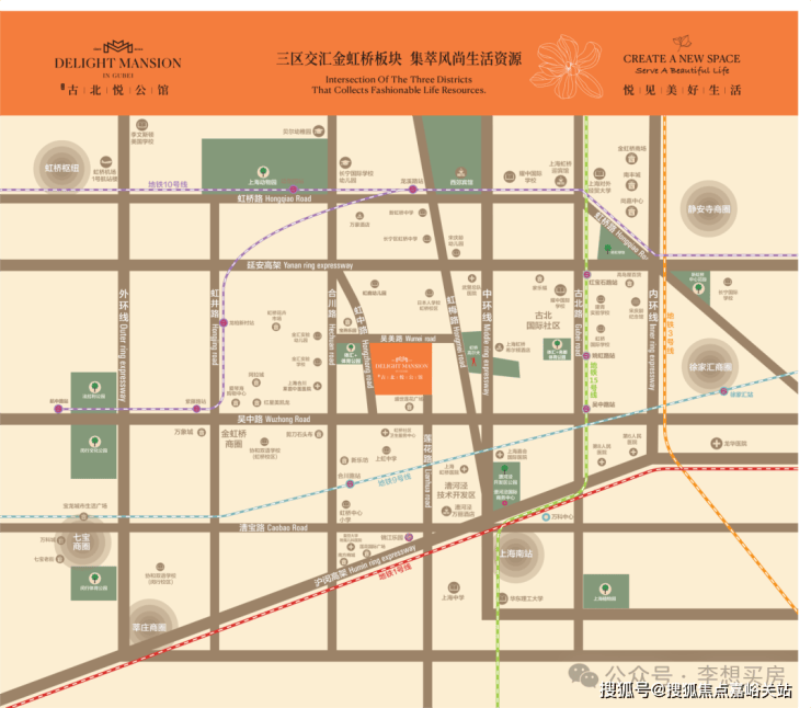 交通配套方面:项目地处长宁、徐汇、闵行三区交汇的金虹桥板块的核心区位,拥有多维立体的交通,延安高架、中环线、外环线环伺。