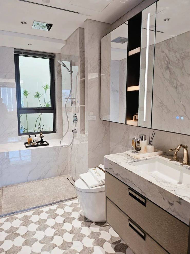 奢石台面,皮革饰面柜抽屉,侧端设置金属收纳开放格;定制镜柜,中间的透光玉石直接提升了高级感,镜柜内部配备了美妆冰箱+美妆灯条+轨道收纳!