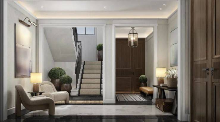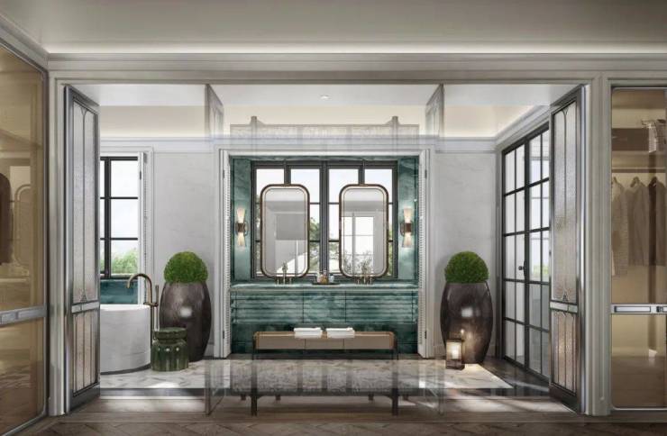 建筑面积约495㎡传家大宅,海派气质内外辉映;深色木饰面与柔和的刺绣主背景,框定空间层次格局,营造稳当厚重的氛围基调,法式留白的墙面与顶部造型,与原筑提取的典型拼花地砖相呼应,经典的精致与典雅,海派传家大宅的气度不言而明。