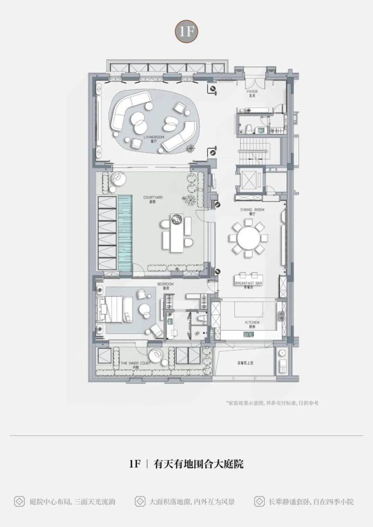 • 一层长辈套房设计,南向独立小庭院,莳花弄草,晨练太极自在四季
