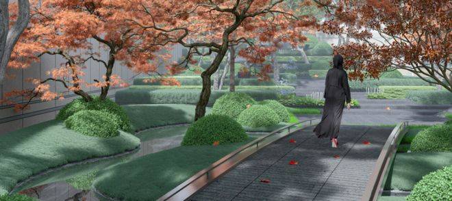 社区景观上,项目邀请了朗道国际设计有限公司,以国际视野打造一处极具高品位、艺术感、精致感、都市中的高端定制水岸度假式花园。形成一轴一环多园的空间格局。