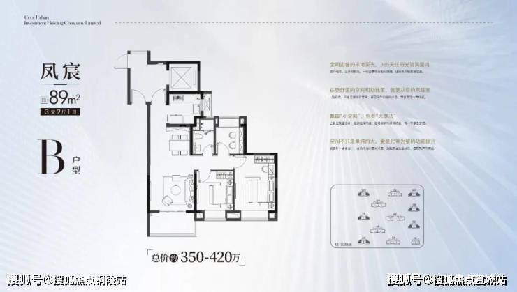 · 建面约89㎡户型则做到了3房的功能性,且三开间朝南+动静分区,设计水准颇高!