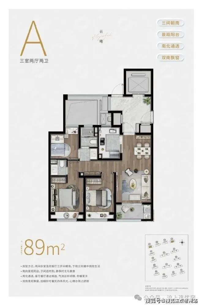 89㎡三房:南北通透,主卧套房设计,干湿分离卫浴,满足年轻家庭的功能需求。