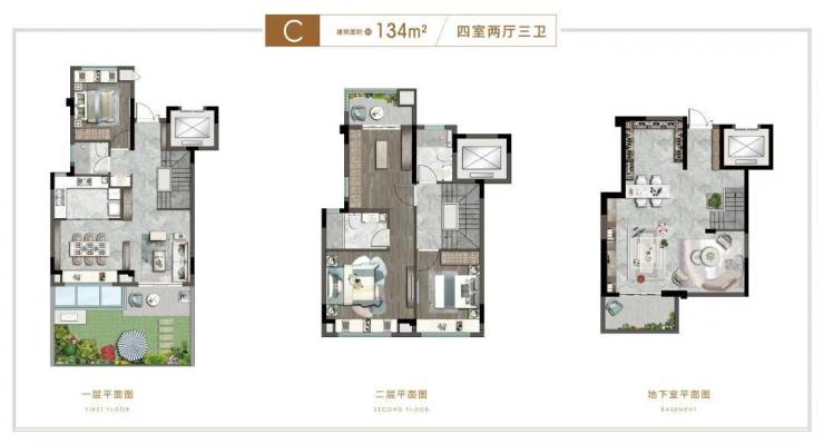 约134平下叠4房户型,紧邻贝港河畔,纯美水岸筑造诗意栖居,全房共有2层并附赠全明地下室,地上首层为生活区,设计南向绿化空间,做到真正的有天有地有花园!