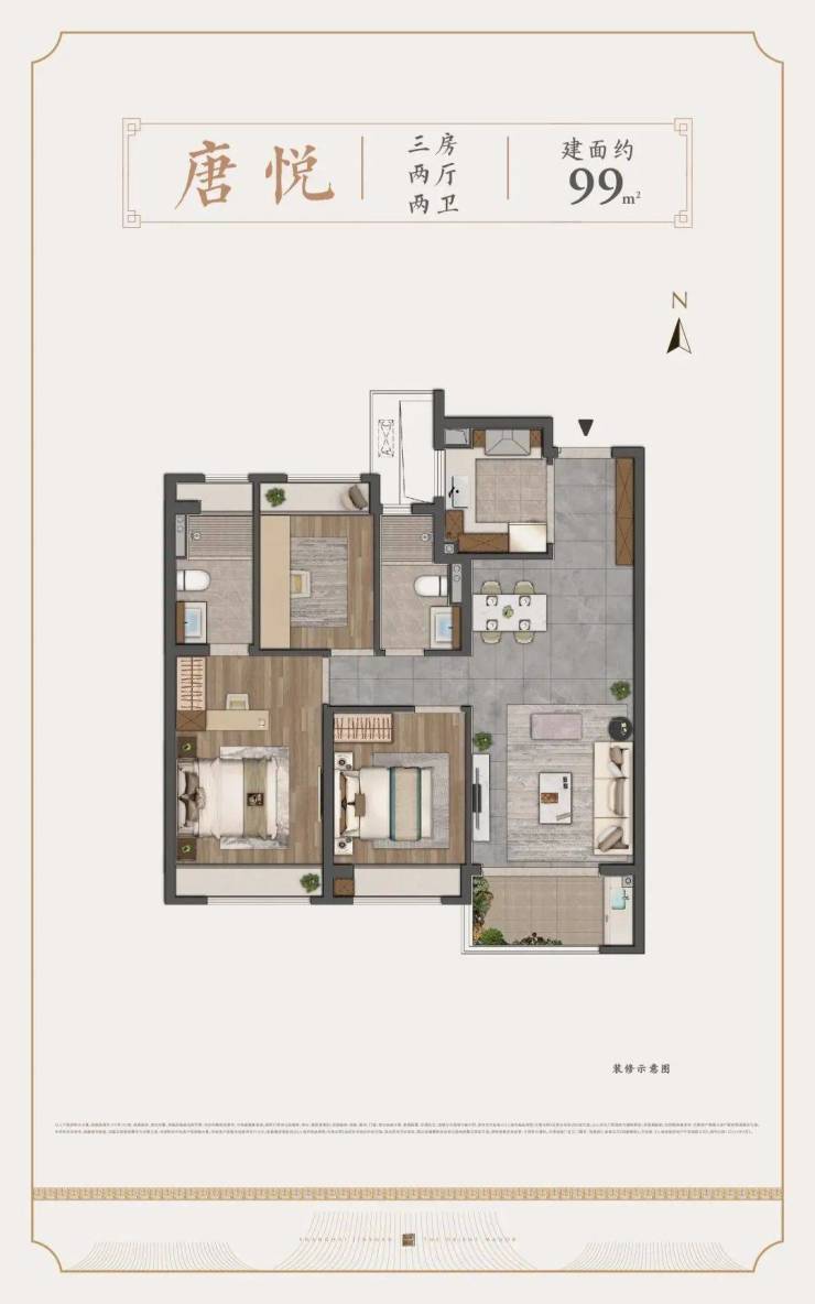 约99㎡3房2卫,汇聚了市面上优秀户型应该有的大多数特质。