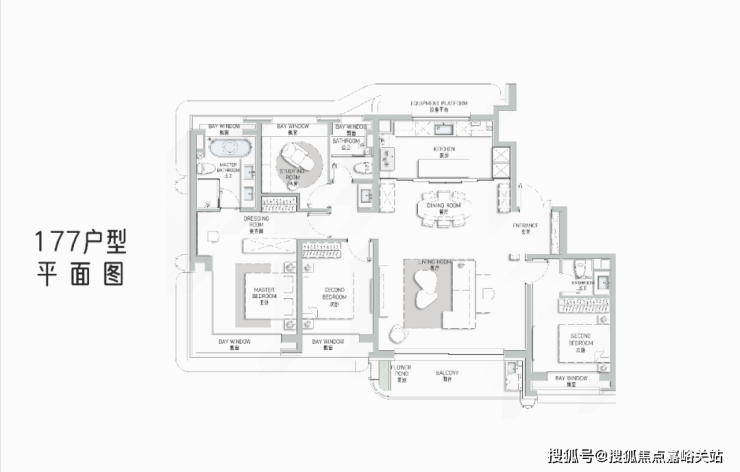 177㎡艺术贵雅奢邸是海上·清和玺压轴力作,延续玺系经典的设计理念和思路, 阔朗的四面大开间设计,客厅做到了 大横厅设计,延续了曲面流体的阳台,并赠送了独具特色的阳台迷你花园。