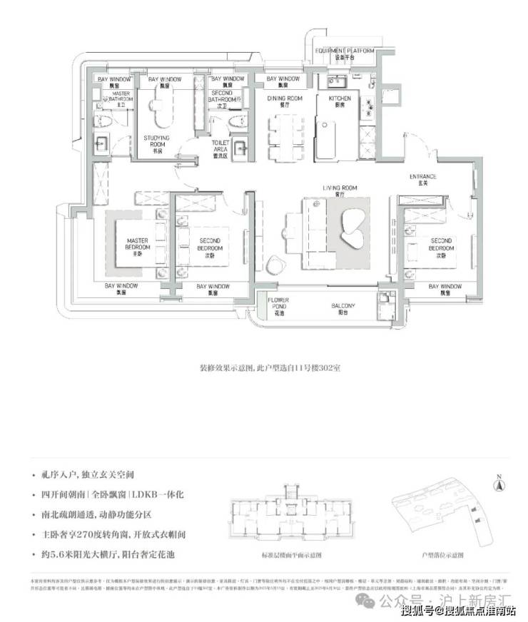 3、南向四开间,面宽约15.5m,独立餐客厅,南北通透