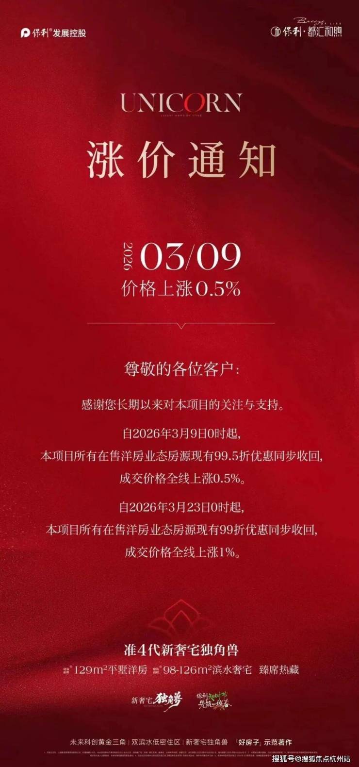 根据爆出的通知显示,本次涨价内容为,“收回在售洋房房源99.5折优惠,成交价全线上涨0.5%”。