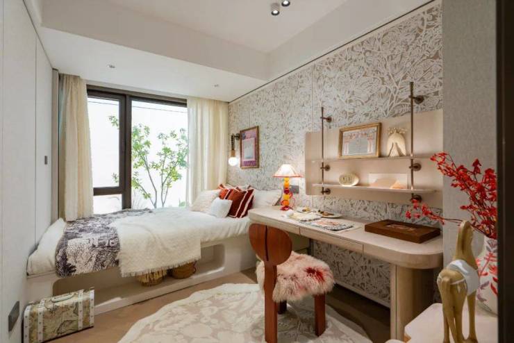 ☮🔥上海宝山招商序乐章售楼处电话:400-8787-740👈🔥的北次卧不仅能放下一张完整的床,还能放下一张大尺寸的办公桌或者是梳妆台,甚至还有空间做一些收纳柜和床头柜等。
