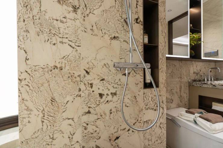 比如:除了卧室的拼花地板外,墙面与地面绝大部分都是岩板与奢石!就连卫生间的墙面、餐客厅外连通的阳台都做到了岩板通铺。☮🔥上海宝山招商序售楼处电话:400-8787-740👈🔥