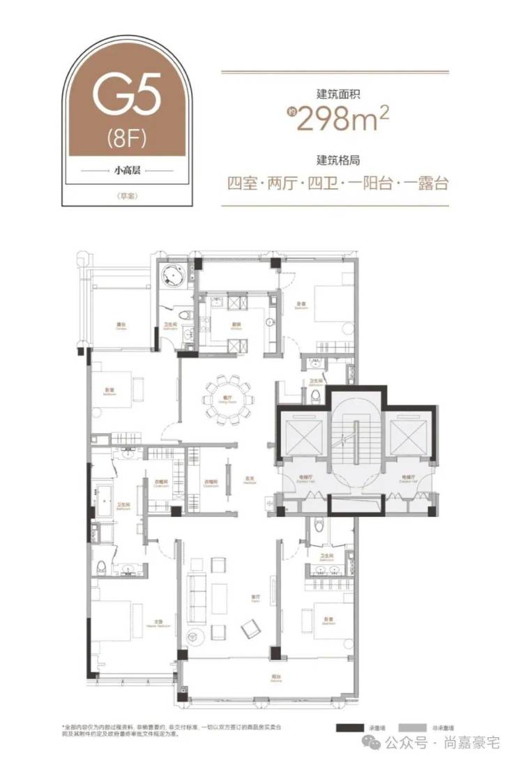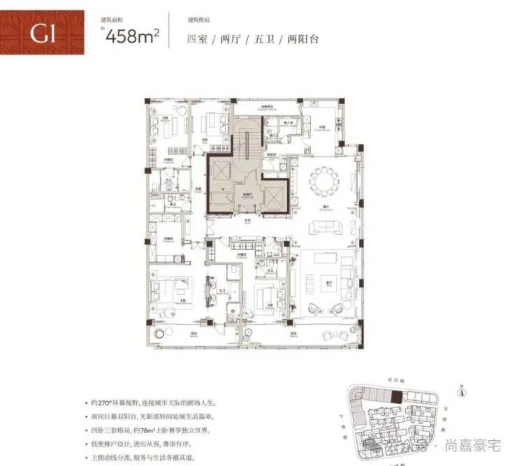 3. 套房顶配:四卧三套房设计搭配双公卫,约78㎡主卧套间配备殿堂级衣帽间与双台盆卫浴,三间套房均设独立衣帽间(两间带阳台),全方位满足高端居住的私密与仪式感。