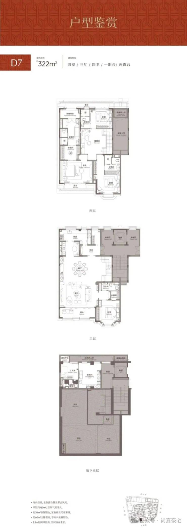 3. 舒居格局:单层约160㎡空间内,60㎡客餐厅贯通休闲阳台,全套房设计保障每位居者的私密与舒适;3.5m(三层)与3.6m(四层)层高,让纵向空间更显阔绰。