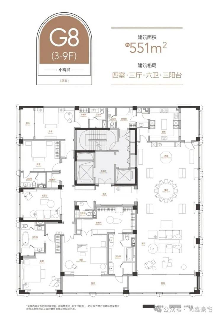 3. 尺度奢阔:约10.5米南向面宽拉通横向视野,单层超160㎡的空间内,客餐厅约60㎡、主卧约60㎡贯通式布局,全套房设计让家人各得其所;3.5m与3.6m递进式层高,赋予空间尊崇的纵向尺度。