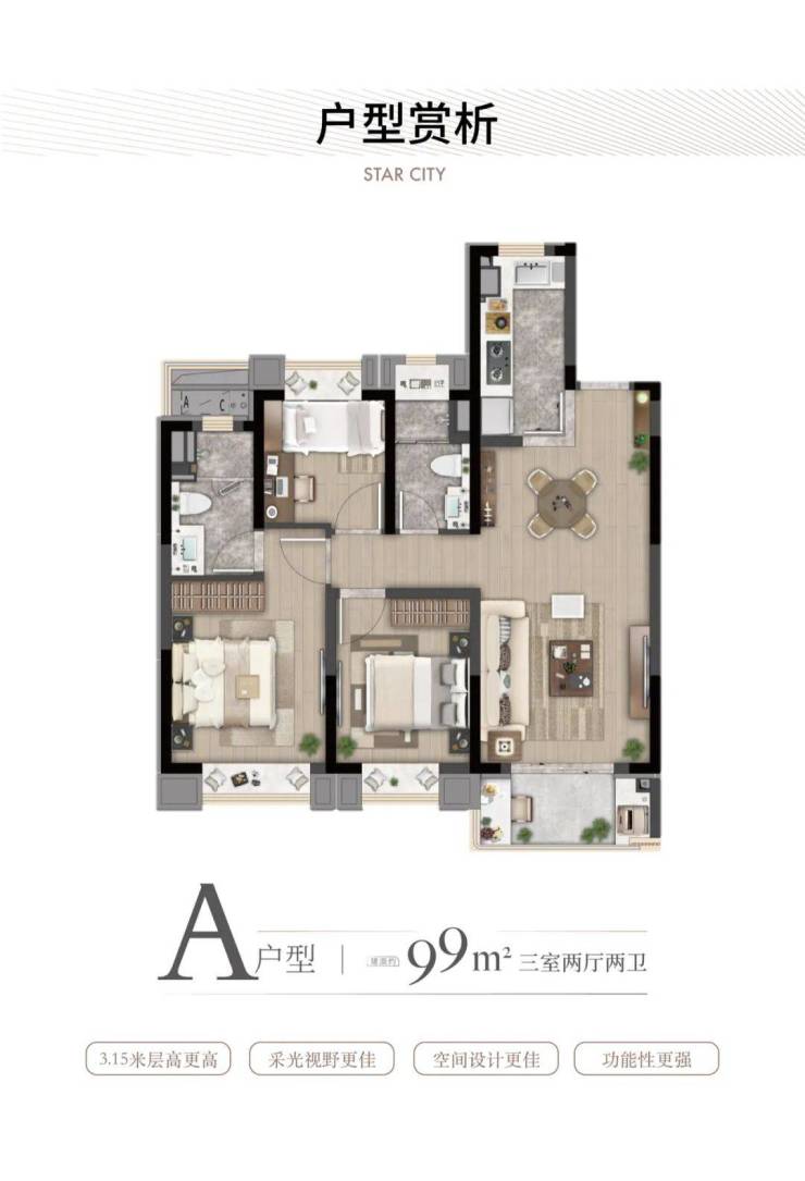 A户型 建面约99㎡三室两厅两卫▼
