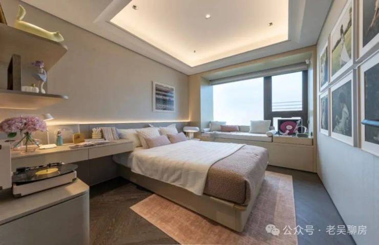 2# 号楼的边套主卧户型配置 270° 环幕飘窗,不仅延伸空间尺度,更将水岸、园景 “框” 成私藏壁画。晨间,阳光透过飘窗铺满床榻;深夜,枕着河风与月光入眠,这是专属建面约 165㎡的 “观景特权”,让每一寸空间都流淌着自然诗意。