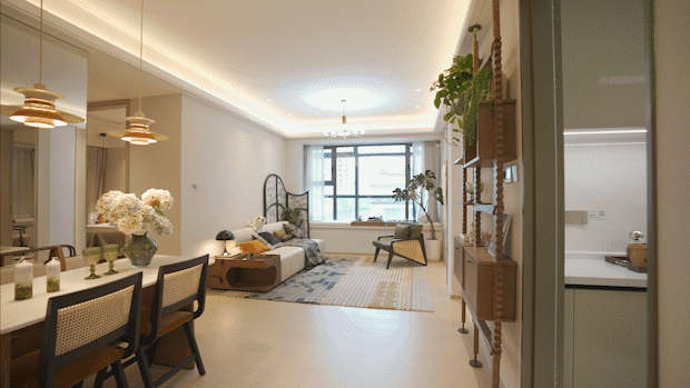 厨房餐厅以及客厅相连搭配超大飘窗,不仅动线合理,还能保证整体室内的充足采光。