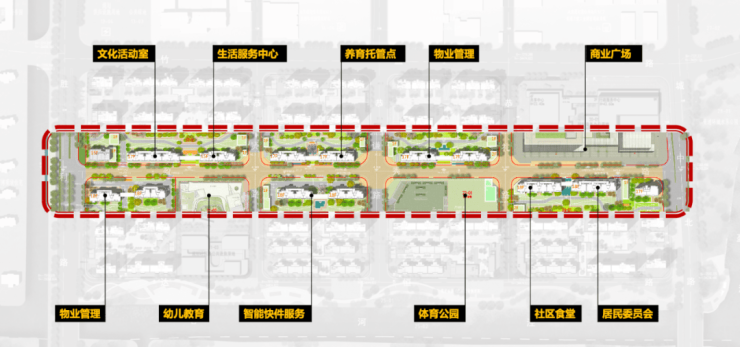 一轴:幼儿园、体育公园、快递驿站、文化活动空间等